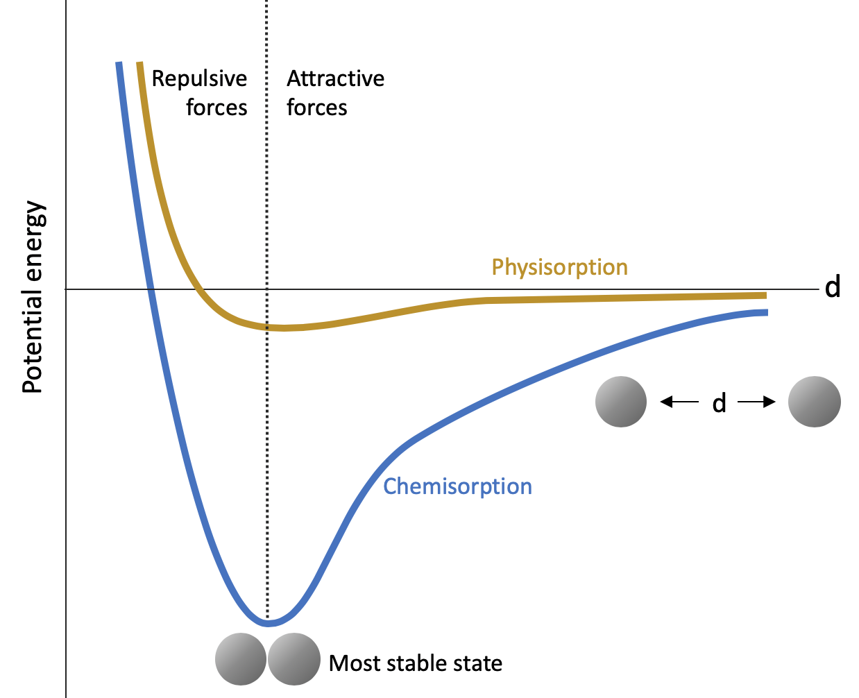 Adsorption is the adhesion of atoms or molecules to a surface (not to be confused with absorption, which is uptake into the bulk). In chemisorption, the adsorbate forms a chemical bond with the surface. In physisorption, the interaction is weaker (van der Waals forces only). ↩