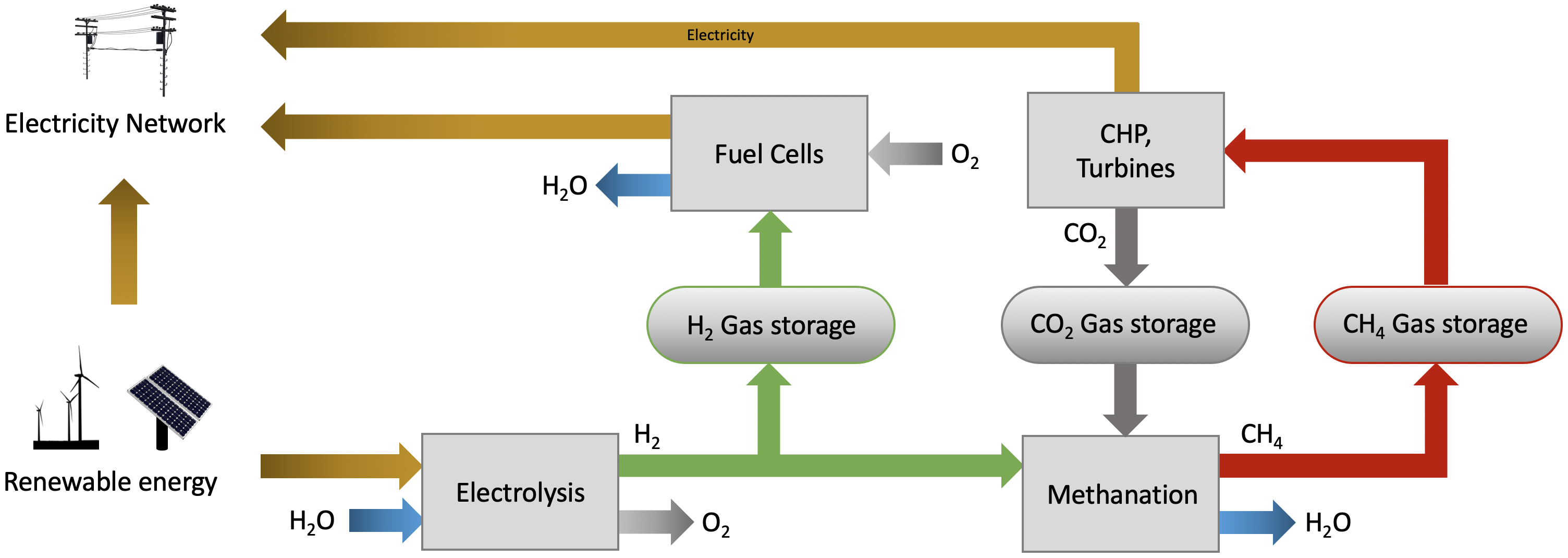 - Hydrogen energy storage (HES): Use excess electricity to split water (electrolysis),9 store the hydrogen, and convert it back to electricity in a fuel cell10 when needed. Round-trip efficiency is lower (~35%), but hydrogen can be stored in bulk at low cost — underground caverns, pressurized tanks, or converted to methane for existing natural gas infrastructure.