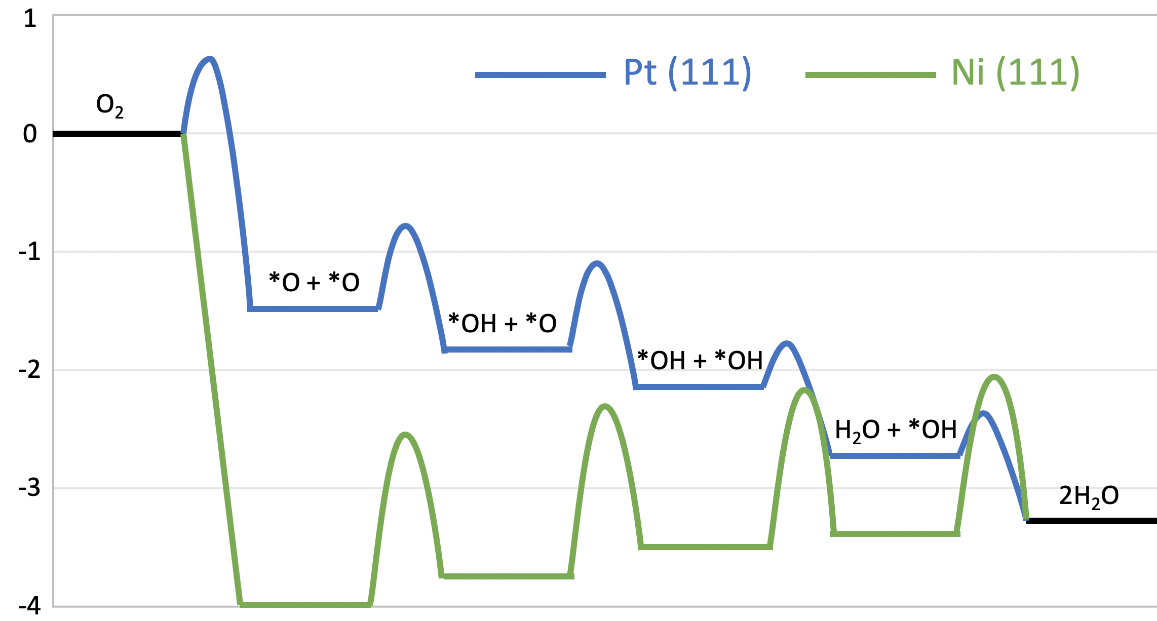 A reaction intermediate is a molecule that is produced in one step of a multi-step reaction and consumed in a subsequent step. It exists transiently on the catalyst surface. For the oxygen reduction reaction, the intermediates are \(*\)O and \(*\)OH, where \(*\) denotes binding to the surface. ↩