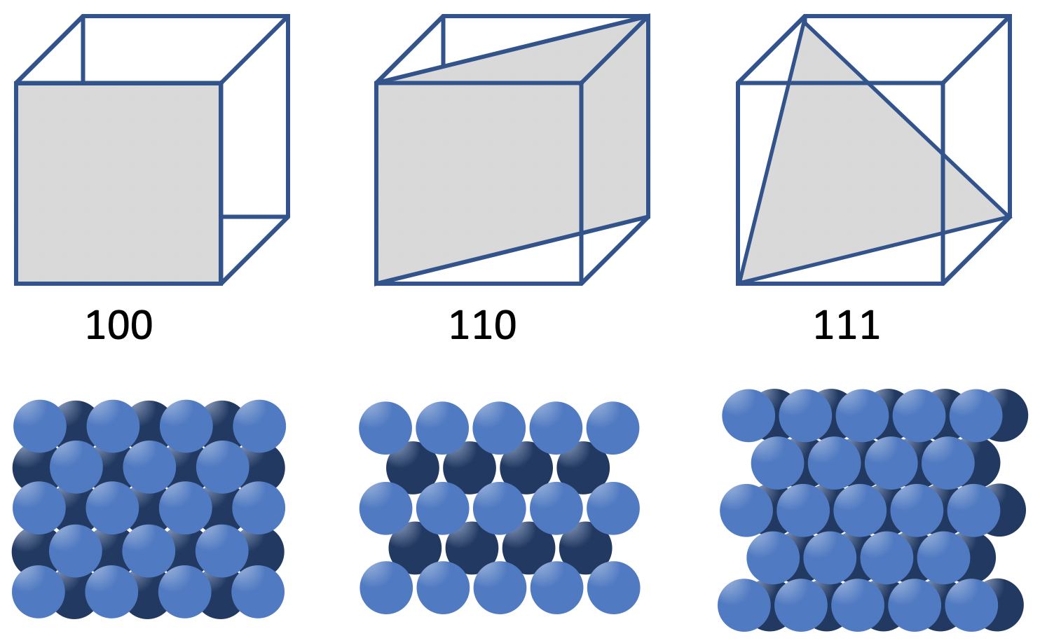 A crystal facet is the flat surface exposed when a crystal is cut along a specific plane. Different cuts expose different arrangements of atoms. Facets are labeled by Miller indices — e.g., (111), (110), (100) — which describe the orientation of the cutting plane relative to the crystal lattice. ↩