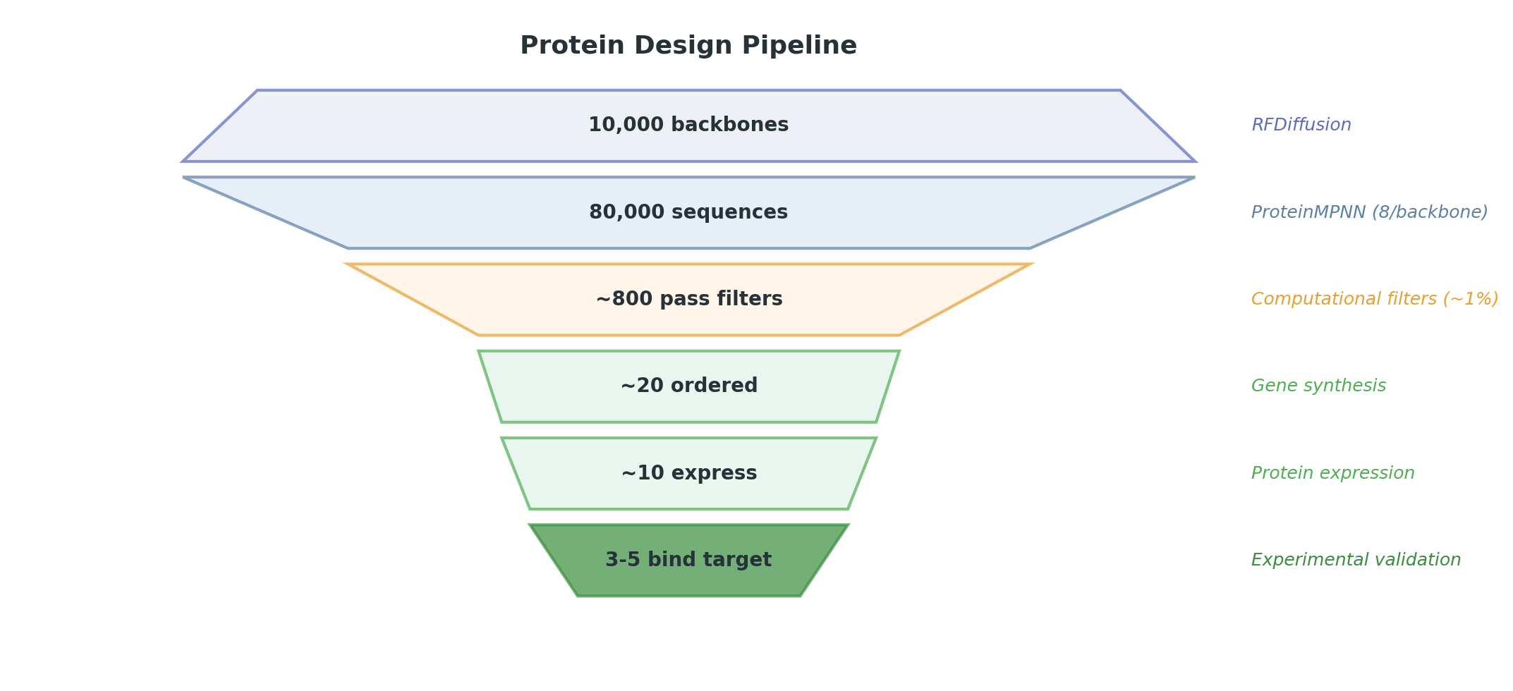 The tools above assemble into a five-step pipeline. The key insight is the numbers at each stage — the funnel from millions of computational candidates to a handful of experimental hits shapes every decision in a design project.