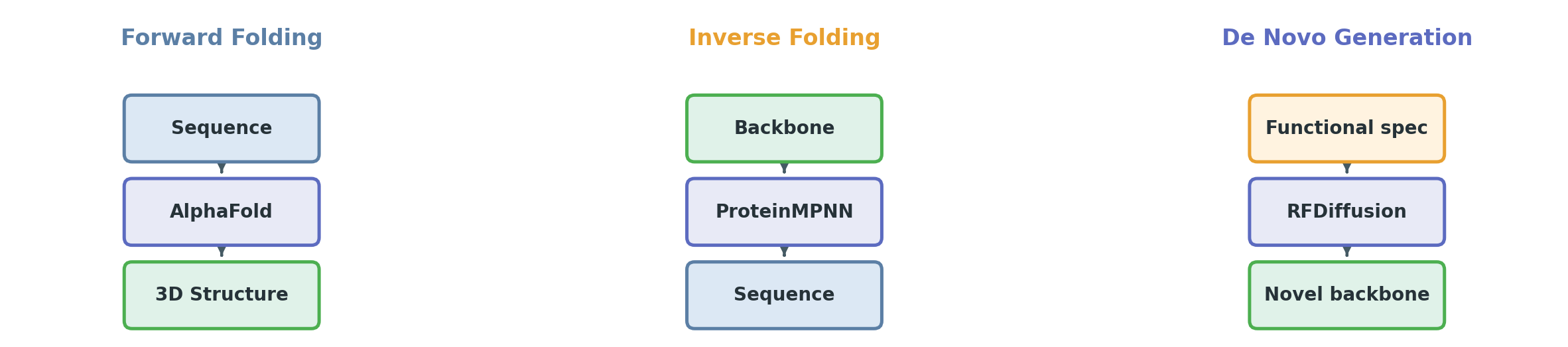Inverse folding (sequence design). Input: 3D backbone coordinates. Output: amino acid sequence that folds into that backbone. Model: ProteinMPNN. This is the core design step — “I drew the blueprint, now find the bricks.”