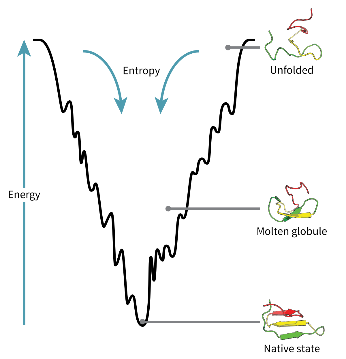- Folding energy landscape: Wikimedia Commons by Thomas Splettstoesser, CC BY-SA 3.0.