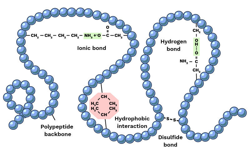 - Disulfide bonds — covalent bonds between two cysteine residues. Molecular staples that physically lock distant parts of the chain together. Common in antibodies and secreted proteins.