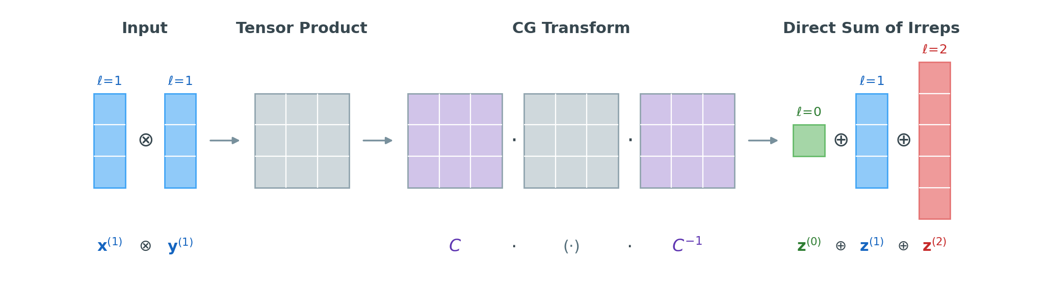 \[\operatorname{vec}(\mathbf{x}^{(\ell_1)} \otimes_{\text{cg}} \mathbf{y}^{(\ell_2)}) \;=\; \mathbf{C}\;\operatorname{vec}(\mathbf{x}^{(\ell_1)} \otimes \mathbf{y}^{(\ell_2)})\]Because \(\mathbf{C}\) absorbs the change of basis, the CG tensor product transforms by the block-diagonal matrix directly—each output block is a spherical tensor that transforms by a single Wigner-D matrix: