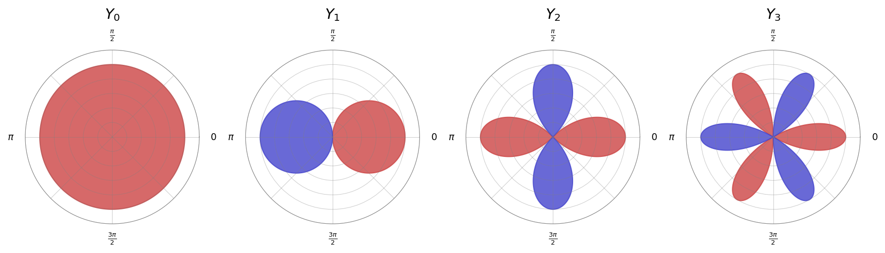 To build intuition, consider the simpler case of the circle first. The circular harmonics $e^{im\phi} = \cos(m\phi) + i\sin(m\phi)$ form a basis for functions on the circle $S^1$. Any function on the circle can be written as a sum of these basis functions (this is the Fourier series). Crucially, each circular harmonic has a simple transformation property under 2D rotations: rotating by angle $\alpha$ multiplies $e^{im\phi}$ by $e^{im\alpha}$. Different values of $m$ transform independently. We write $Y_m(\phi)$ for the real part $\cos(m\phi)$ of each circular harmonic.