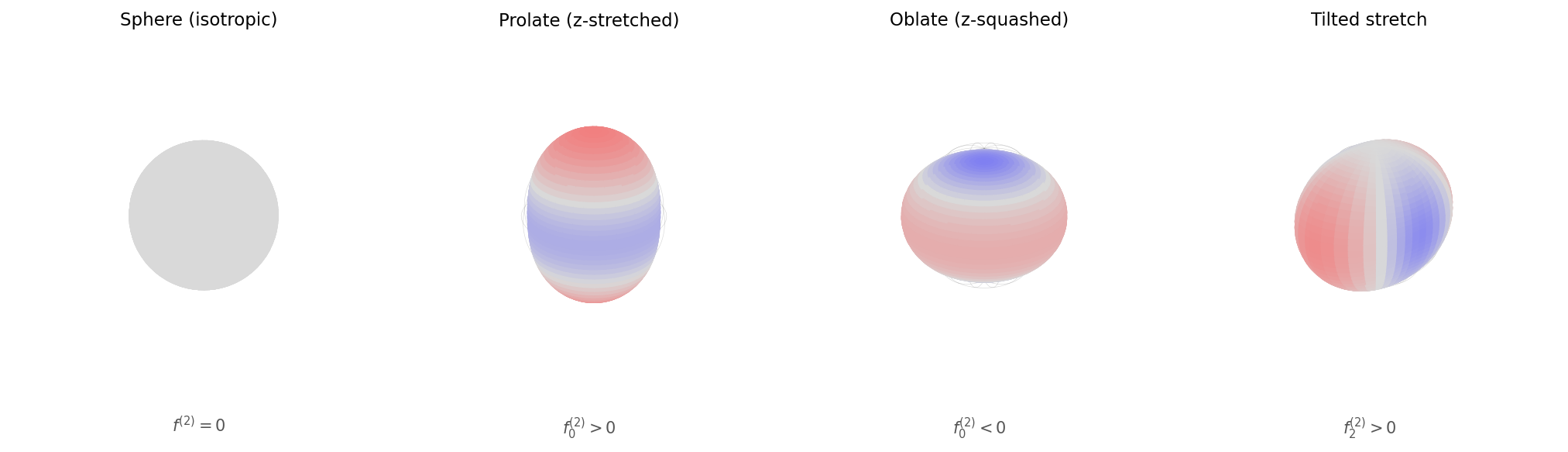 \[r(\hat{\mathbf{r}}) = f^{(0)} Y_0^0(\hat{\mathbf{r}}) + \sum_{m=-2}^{2} f_m^{(2)} Y_2^m(\hat{\mathbf{r}})\]When only the type-0 coefficient is nonzero, \(r\) is constant in every direction — a perfect sphere. Adding type-2 coefficients deforms this sphere into an ellipsoid, capturing how something stretches or compresses along different directions. The sign and choice of component determine whether the shape stretches along the z-axis (prolate), squashes along it (oblate), or tilts the stretch into the xy-plane.