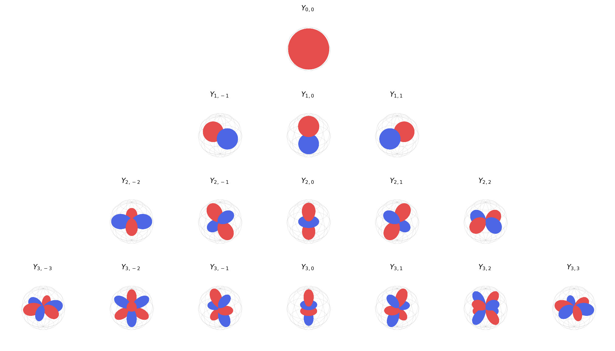 To build intuition for the \(\ell = 2\) row, consider drawing a surface whose radius at each direction \(\hat{\mathbf{r}}\) is determined by a combination of type-0 and type-2 spherical harmonics: